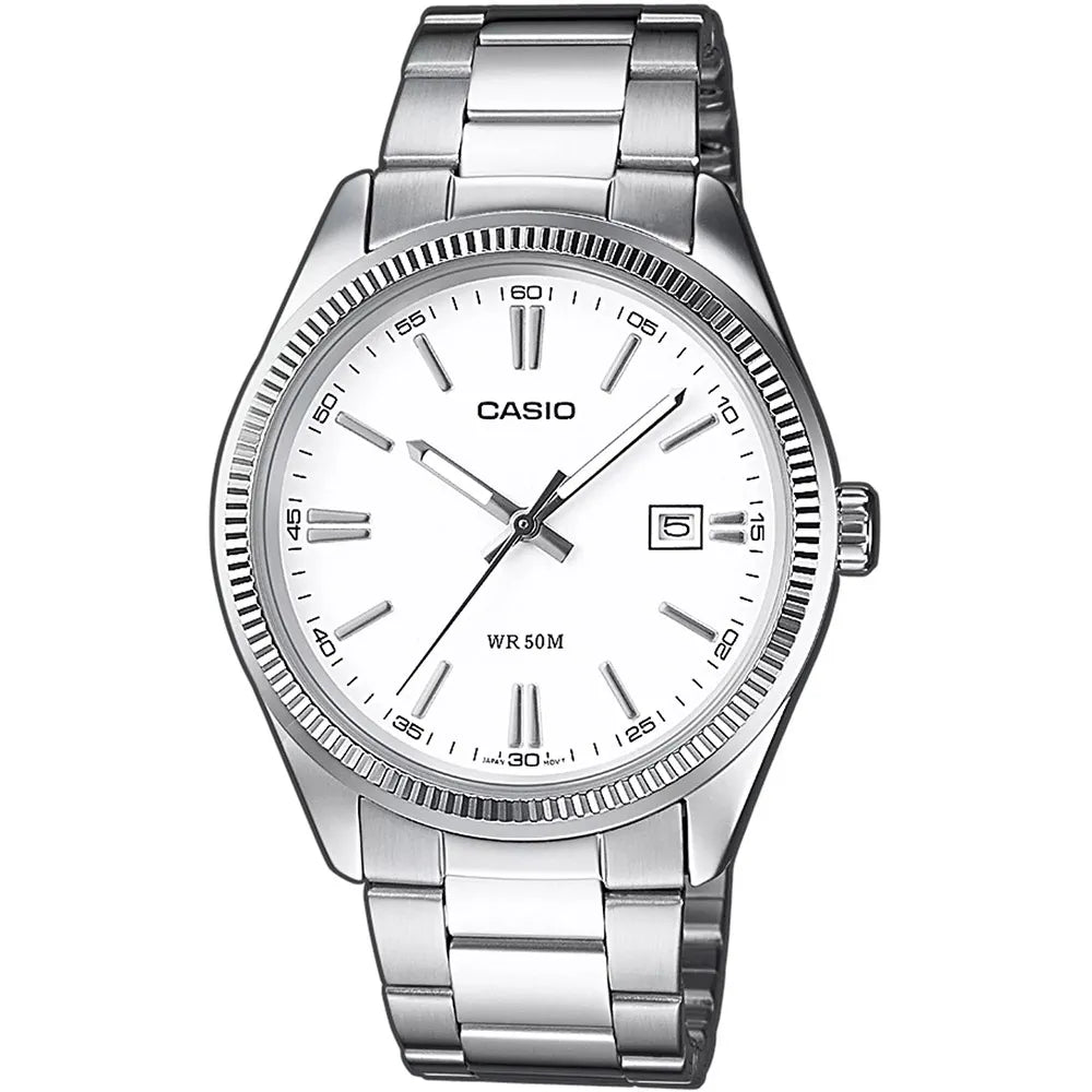 In the realm of timeless elegance, where precision meets style, emerges a masterpiece from the CASIO Collection. Crafted with an eye for detail, this watch embodies the essence of classic sophistication. Its round case, bathed in a sleek silver grey, exudes a refined design that speaks to the modern gentleman's taste. With a case diameter of 38mm, it sits comfortably on the wrist, a testament to its thoughtful craftsmanship. The mineral crystal shields the pristine white dial, where time is elegantly displayed through an analogue format. A subtle date calendar adds a touch of practicality, ensuring you're always in sync with the world. The stainless steel band, matching the case in its silver grey hue, wraps around the wrist with a butterfly deployant clasp, offering both security and ease of wear. The pull & push crown is a nod to traditional watchmaking, while the quartz movement ensures precision in every tick. Water-resistant, this watch is ready to accompany you through life's adventures, whether you're navigating the urban jungle or attending a formal gathering. A harmonious blend of form and function, this CASIO watch is more than a timepiece, it's a statement of enduring style and impeccable taste.