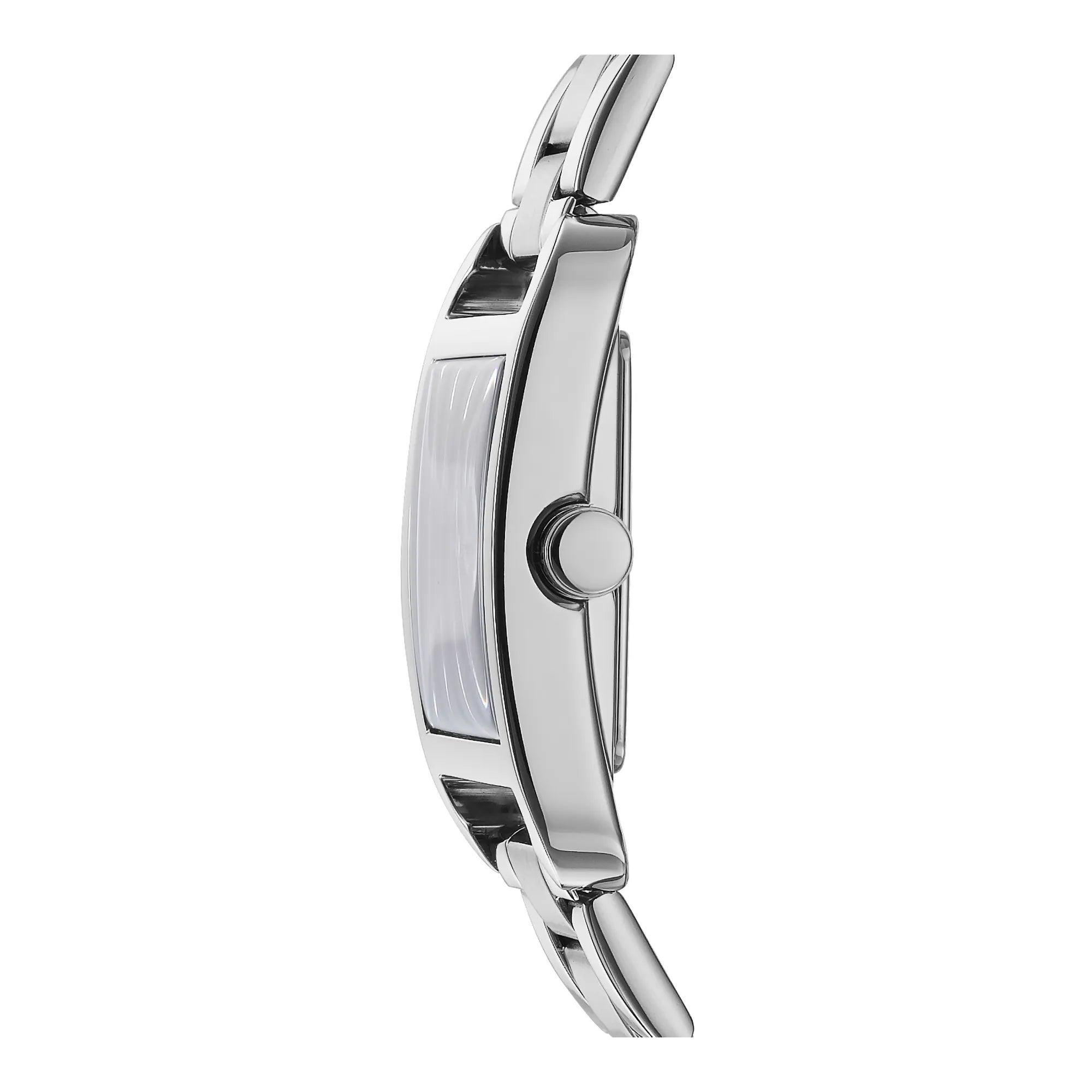 In the bustling heart of the city, where fashion meets function, the DKNY DK1L001 City Maxi watch emerges as a statement of elegance and modernity. Crafted with a refined design, this timepiece captures the essence of urban sophistication. Its sleek rectangular case, bathed in a silver-grey hue, exudes a timeless charm that complements the vibrant fuchsia dial, adding a pop of color to any ensemble. The dial, with its three-hand display, is a testament to the precision of quartz movement, ensuring that time is always on your side. Encased in mineral crystal, the watch is not only a fashion accessory but also a reliable companion, offering water resistance for those unexpected city showers. The stainless steel band, matching the case in its silver-grey elegance, wraps around the wrist with a butterfly deployant clasp, providing both security and style. The push-button mechanism adds a touch of convenience, making it easy to wear and remove. Designed for the modern woman who navigates the city with grace and confidence, this DKNY watch is more than just a timepiece, it's an expression of individuality and flair. Whether you're attending a high-powered meeting or enjoying a leisurely brunch, the DKNY City Maxi watch is your perfect partner, reflecting the vibrant energy of the city and the bold spirit of its wearer.