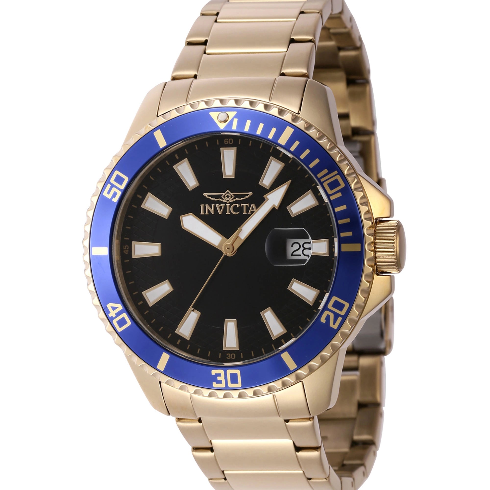 At its heart, the Invicta Pro Diver 46139 is driven by a reliable SEIKO VJ42 quartz movement, providing precise timekeeping alongside a practical date function. The comfortable yellow gold-tone stainless steel band, measuring 21cm in length and 22mm in width, secures firmly with a folding deployant clasp featuring a safety lock, ensuring comfort and peace of mind.