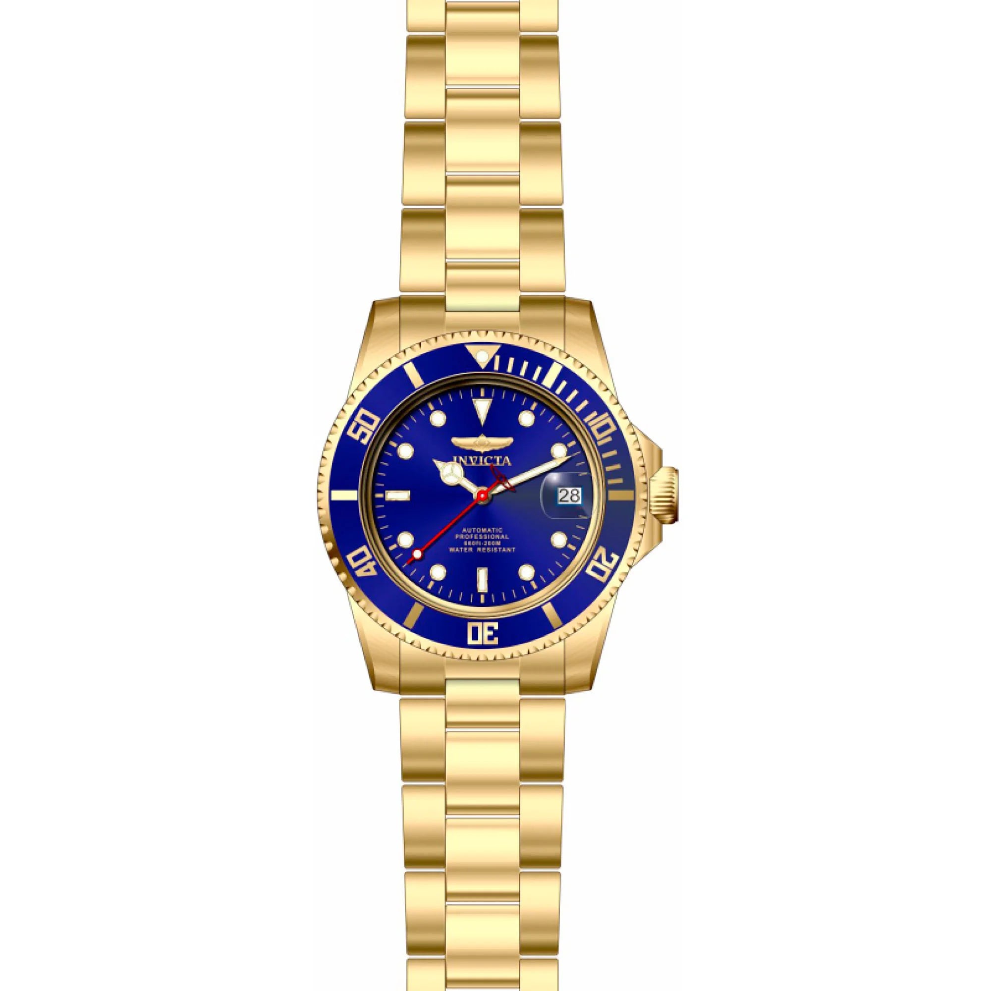 In the world of horology, where precision meets artistry, the Invicta Pro Diver emerges as a beacon of elegance and functionality. Crafted in the heart of innovation, this timepiece is a testament to the seamless blend of style and performance. Its round case, bathed in a luxurious yellow gold hue, captures the eye with a diameter of 40mm, offering a perfect balance between boldness and sophistication. The deep blue dial, reminiscent of the ocean's depths, adds a pop of color that speaks to the adventurous spirit within. Designed for the modern man who values both form and function, this watch boasts a water resistance of up to 200 meters, making it an ideal companion for both casual outings and underwater explorations. The hardlex crystal and screw-down crown ensure durability, while the transparent back reveals the intricate dance of the NH35A caliber, a mechanical marvel with 24 jewels that powers this automatic masterpiece. The stainless steel band, also in yellow gold, wraps around the wrist with a folding deployant clasp and safety lock, ensuring both comfort and security. With an analogue display and a date calendar, this Invicta Pro Diver is not just a watch, it's a statement of refined design and timeless elegance, crafted for those who dare to explore the depths of style and adventure.