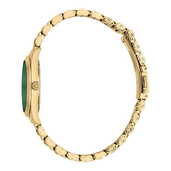 De Just Cavalli Pacentro uit de Glam Chic collectie schittert met zijn ronde kast van geelgoud en flesgroene wijzerplaat. Dit modieuze horloge, met een band van roestvrij staal en vlindersluiting, is ontworpen voor wie durft te kiezen voor gedurfde elegantie.