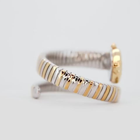 At its heart, the **Fiore watch** is powered by a reliable **SEIKO VJ20 Quartz movement**, ensuring precise timekeeping with a classic 2-hand display. The 12mm wide **stainless steel bracelet** features a sophisticated **Silver grey** and **Yellow Gold IP plated** finish, echoing the unique **snake-inspired** design elements of the **Lady Snake** family.