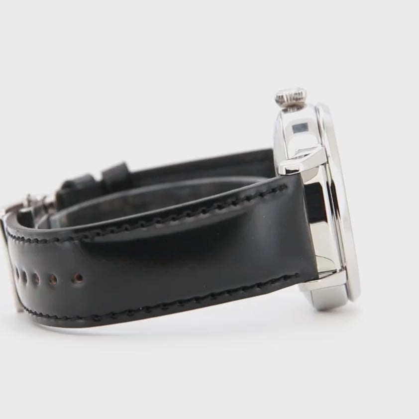 The watch is secured to your wrist with a high-quality black leather strap, complemented by a comfortable and secure folding deployant clasp with a push-button release. With a 20mm band width, it provides a perfect fit. Designed for daily elegance, it offers 50 meters (5 ATM) of water resistance, making it suitable for splashes and brief immersion.