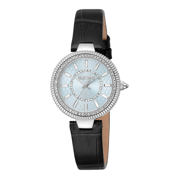 In the realm of fashion, where elegance meets audacity, emerges a timepiece that captures the essence of modern sophistication. This Just Cavalli Watch, from the illustrious Glam Chic collection, is a testament to the brand's commitment to style and innovation. Crafted with a refined design, its round silver-grey case, measuring a delicate 30mm in diameter, exudes a subtle yet striking presence on the wrist. The mineral crystal face offers a clear view of the light blue dial, a hue that adds a pop of contemporary flair, reminiscent of a serene sky on a bright day. The three-hand quartz movement ensures precision, while the pull & push crown allows for effortless time adjustments. Encased in a water-resistant shell up to 50 meters, this watch is as practical as it is beautiful. The black leather band, secured with a tang buckle, provides a comfortable and secure fit, making it an ideal accessory for the fashion-forward woman. This watch is not just a timekeeping device, it is a statement of style, a reflection of the wearer's bold character and refined taste. Whether paired with a casual ensemble or an elegant evening gown, this Just Cavalli Watch is designed to turn heads and spark conversations, embodying the spirit of those who dare to stand out in a crowd.
