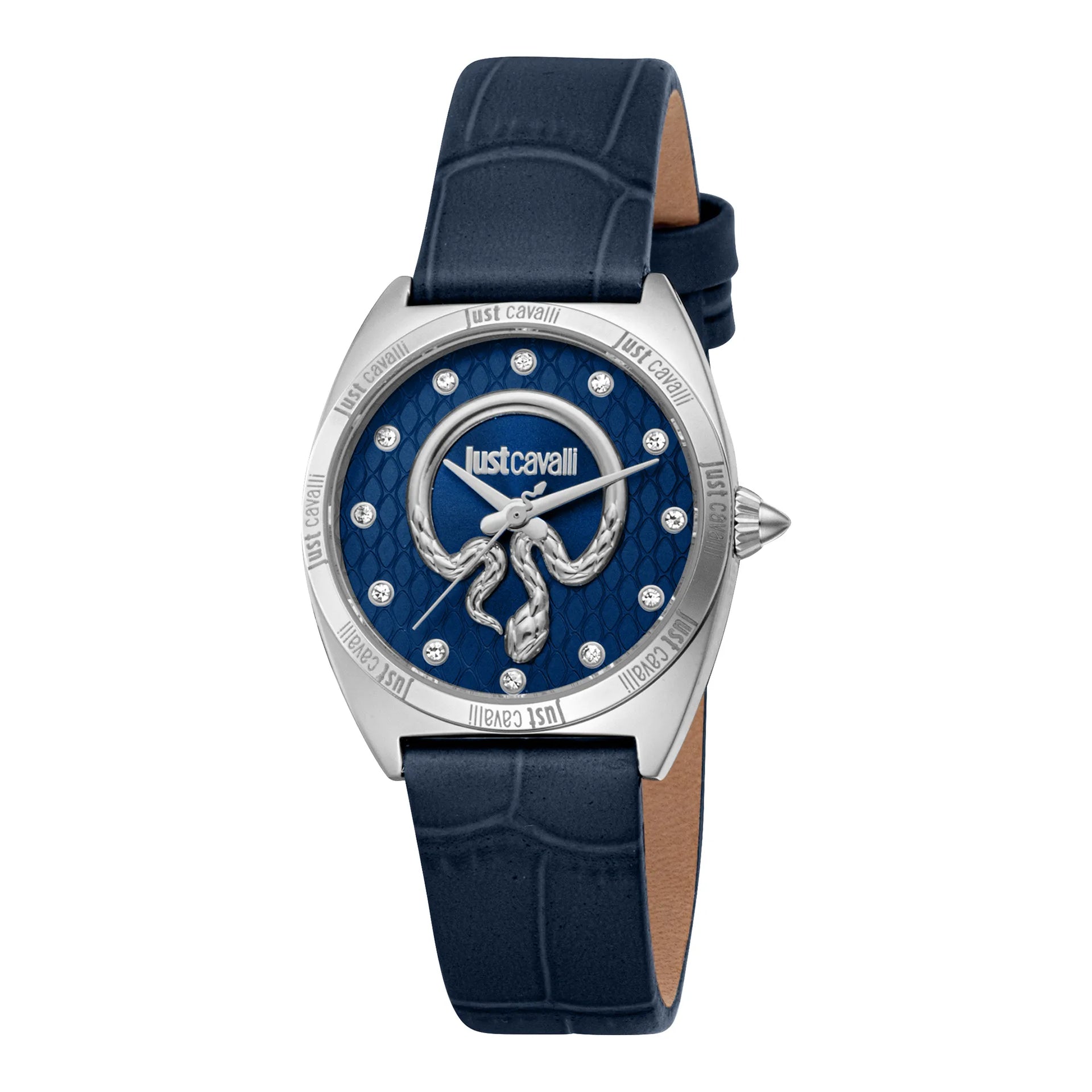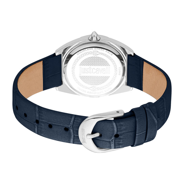In the realm of fashion, where elegance meets audacity, emerges a timepiece that captures the essence of sophistication and style. Crafted with precision, this Just Cavalli Watch is a testament to refined design and exquisite craftsmanship. Its round case, bathed in a lustrous silver grey, exudes a timeless allure, perfectly complementing the night blue leather band that wraps gracefully around the wrist. The harmonious blend of colors creates a striking contrast, making it a statement piece for the modern woman who dares to stand out. The night blue dial, a canvas of deep elegance, is adorned with delicate markers that dance under the mineral crystal, offering a glimpse into the world of precision timekeeping. With a case diameter of 30mm, this watch is a perfect balance of subtlety and presence, while the tang buckle closure ensures a secure and comfortable fit. Water-resistant and powered by a reliable quartz movement, it promises both functionality and style. The pull & push crown adds a touch of classic charm, inviting you to explore the art of time. This Just Cavalli Watch is not just an accessory, it's a celebration of fashion and femininity, a piece that whispers tales of elegance and boldness with every tick.