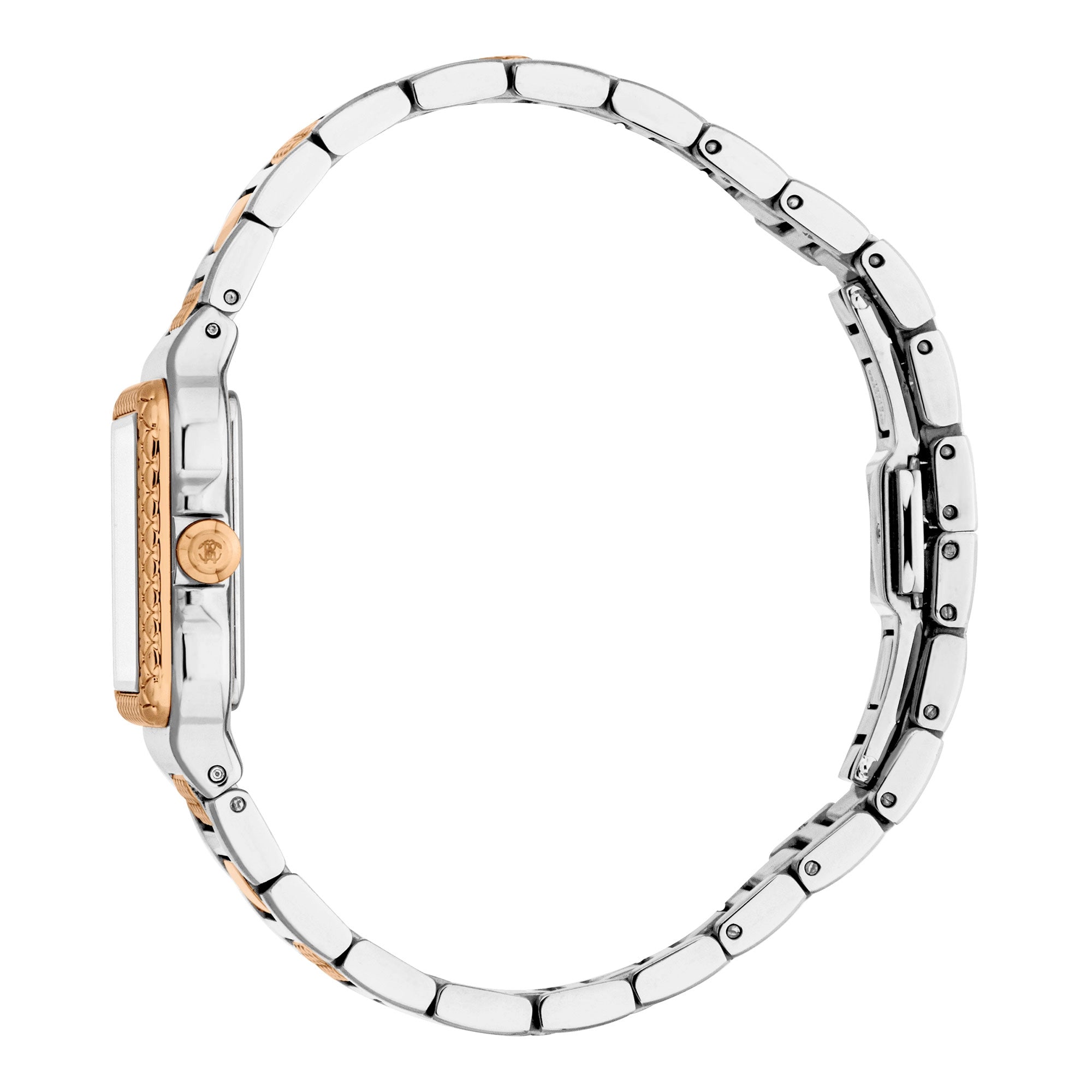 Its distinctive **squared stainless steel case** features an elegant **silver grey** finish with subtle **rose gold IP plating** accents, creating a chic two-tone appeal. With a slender 8mm thickness, it offers a comfortable fit without compromising on style. The watch is equipped with a durable **mineral crystal** and a convenient pull & push crown, ensuring both clarity and ease of use. This model is also **water resistant**, adding to its everyday practicality.