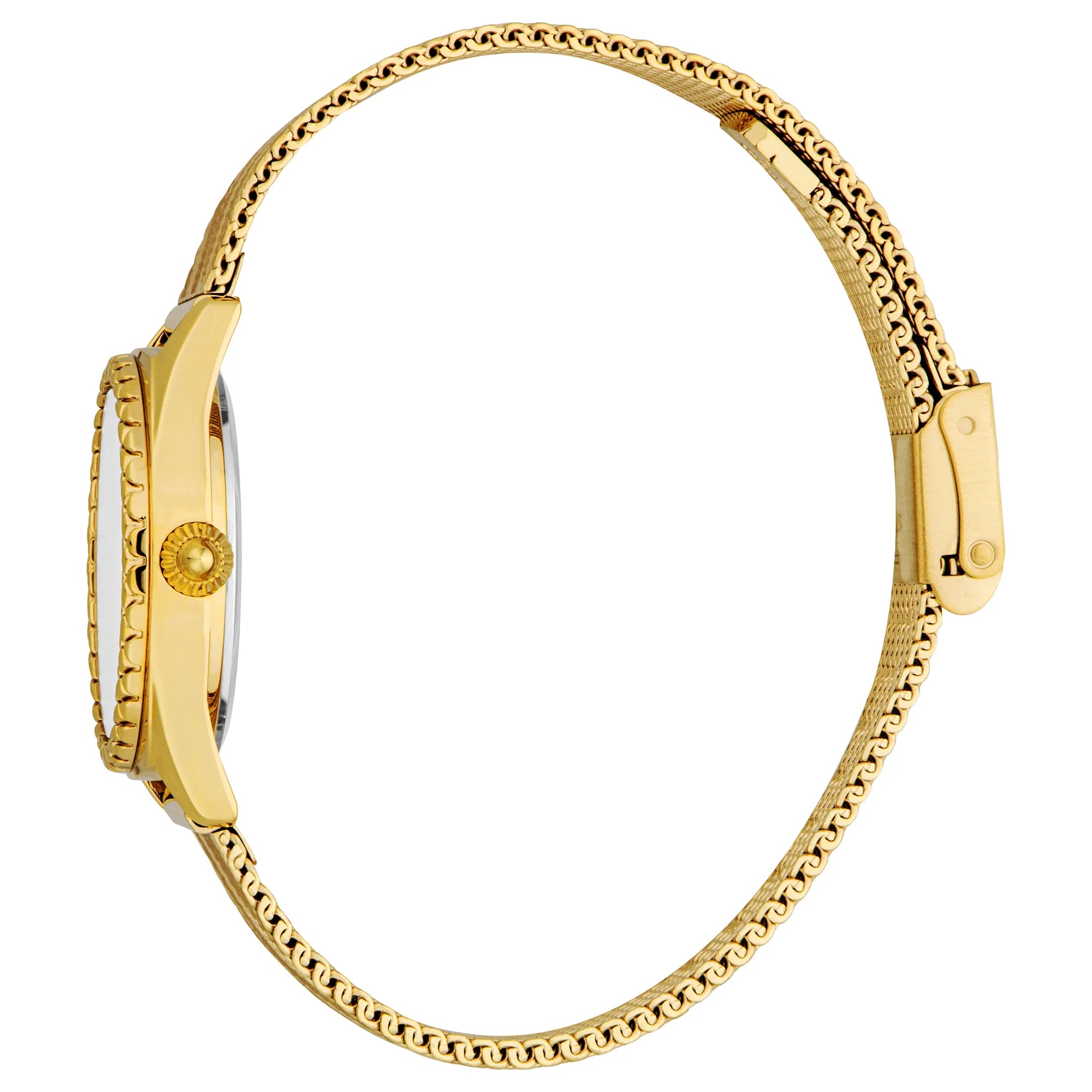 In the world of fashion, where elegance meets audacity, the Just Cavalli Lustro watch from the Animalier collection stands as a testament to refined design and bold character. Crafted in the heart of Swiss watchmaking, this exquisite timepiece captures the essence of modern femininity with its round, yellow gold case that gleams with sophistication. The 30mm diameter is perfectly proportioned for the wrist of a woman who appreciates both style and substance. Water-resistant and protected by a mineral crystal, this watch is as practical as it is beautiful, ready to accompany you through life's adventures. The pull & push crown adds a touch of classic charm, while the adjustable slide clasp ensures a perfect fit. The stainless steel band, also in a luxurious yellow gold hue, complements the case, creating a seamless flow of elegance. The silver-grey dial, with its three-hand quartz movement, offers a subtle yet striking contrast, embodying a pop of contemporary flair that is both chic and timeless. This Just Cavalli watch is more than just an accessory, it's a statement of individuality and grace, designed for the woman who dares to stand out in a crowd. With every glance at your wrist, you're reminded of the perfect blend of fashion-forward design and the enduring allure of Swiss craftsmanship.