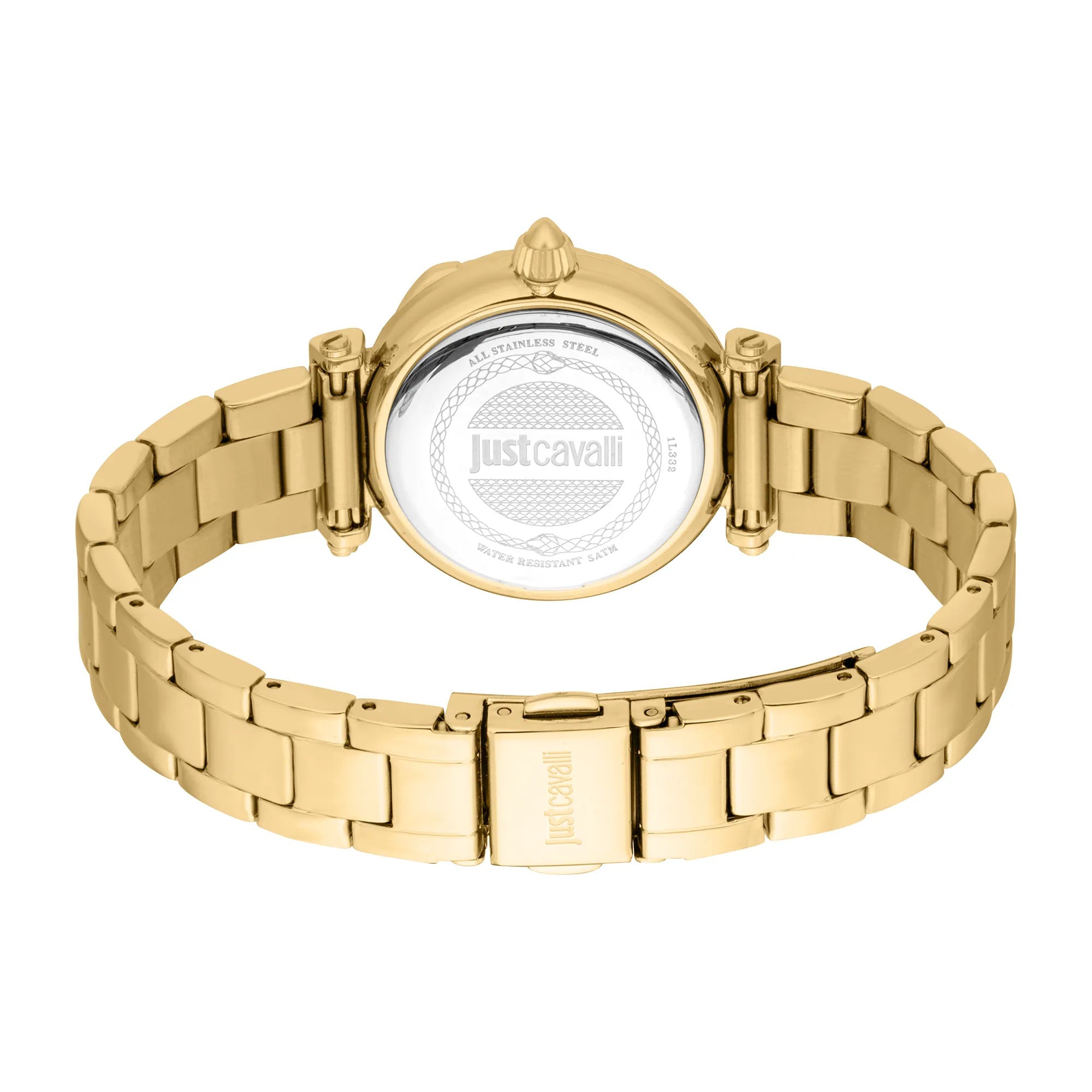 In the world of fashion, where elegance meets audacity, the Just Cavalli JC1L332 Curiosa watch stands as a testament to refined design and sophisticated allure. Crafted with precision, this exquisite timepiece is a harmonious blend of style and functionality, perfect for the modern woman who appreciates the finer things in life. The round case, bathed in a luxurious yellow gold hue, captures the essence of timeless beauty, while its 30mm diameter ensures a graceful presence on the wrist. The silver-grey dial, a canvas of subtle sophistication, is adorned with three hands powered by a reliable quartz movement, offering both precision and elegance. The mineral crystal adds a layer of durability, protecting the watch from the rigors of daily wear. With a water resistance of up to 50 meters, this watch is as versatile as it is beautiful, ready to accompany you from the boardroom to the ballroom. The stainless steel band, also in a matching yellow gold tone, wraps around the wrist with a sense of opulence, secured by a folding deployant clasp with a push-button for ease and comfort. This Just Cavalli watch is more than just a timepiece, it's a statement of fashion-forward thinking, a celebration of bold design and impeccable craftsmanship. Whether you're dressing up for a special occasion or adding a touch of glamour to your everyday ensemble, the JC1L332 Curiosa watch is your perfect companion, embodying the spirit of Just Cavalli's daring and distinctive style.