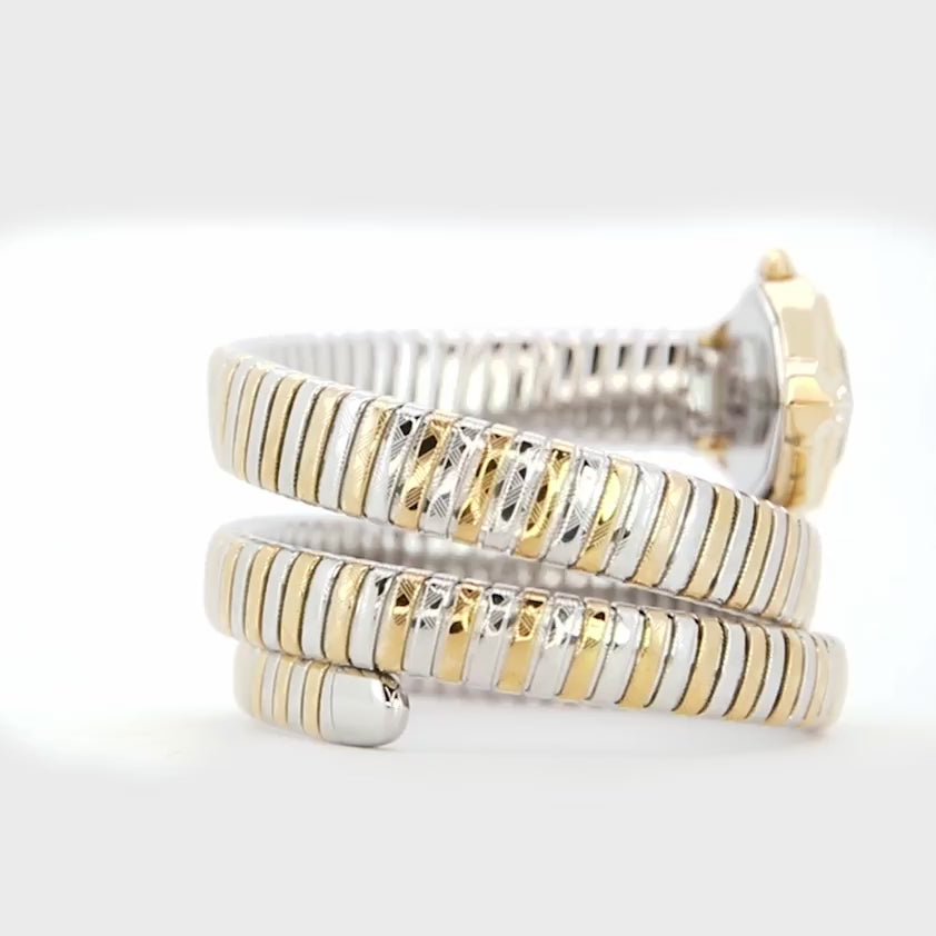 The watch features a distinctive hexagonal stainless steel case in lustrous yellow gold, adorned with sparkling zircons for an added touch of luxury. Its eye-catching bottle green dial is beautifully complemented by a two-tone stainless steel band in yellow gold and silver grey, evoking the iconic snake motif that defines the Signature Snake family.