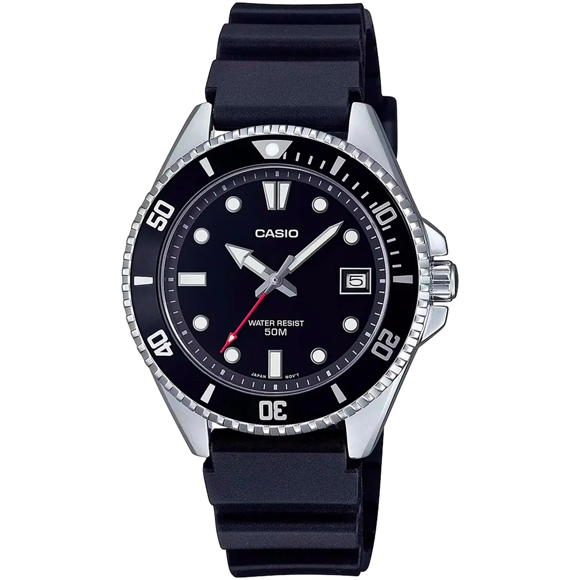 In the realm of timekeeping, where precision meets style, emerges a creation that embodies the essence of casual sophistication. Crafted with a refined design, this Casio watch from the esteemed CASIO Collection is a testament to the art of watchmaking. Its round case, bathed in a sleek silver-grey hue, measures a comfortable 38mm in diameter, making it a perfect companion for the modern man who values both form and function. The mineral crystal shields the dial, ensuring clarity and durability, while the pull & push crown offers seamless adjustments. Encased within is a reliable quartz movement, a hallmark of accuracy, complemented by an analogue display that elegantly showcases the time. The black dial, a canvas of understated elegance, features a day and date calendar, adding practicality to its charm. The watch is adorned with a black rubber band, offering a comfortable fit and a touch of contemporary flair, secured with a tang buckle closure. Water-resistant, it stands ready to accompany you through life's adventures, whether you're navigating the urban jungle or enjoying a leisurely day by the water. This Casio watch is more than a timepiece, it's a statement of effortless style and functionality, designed for those who appreciate the finer things in life without compromising on everyday practicality.