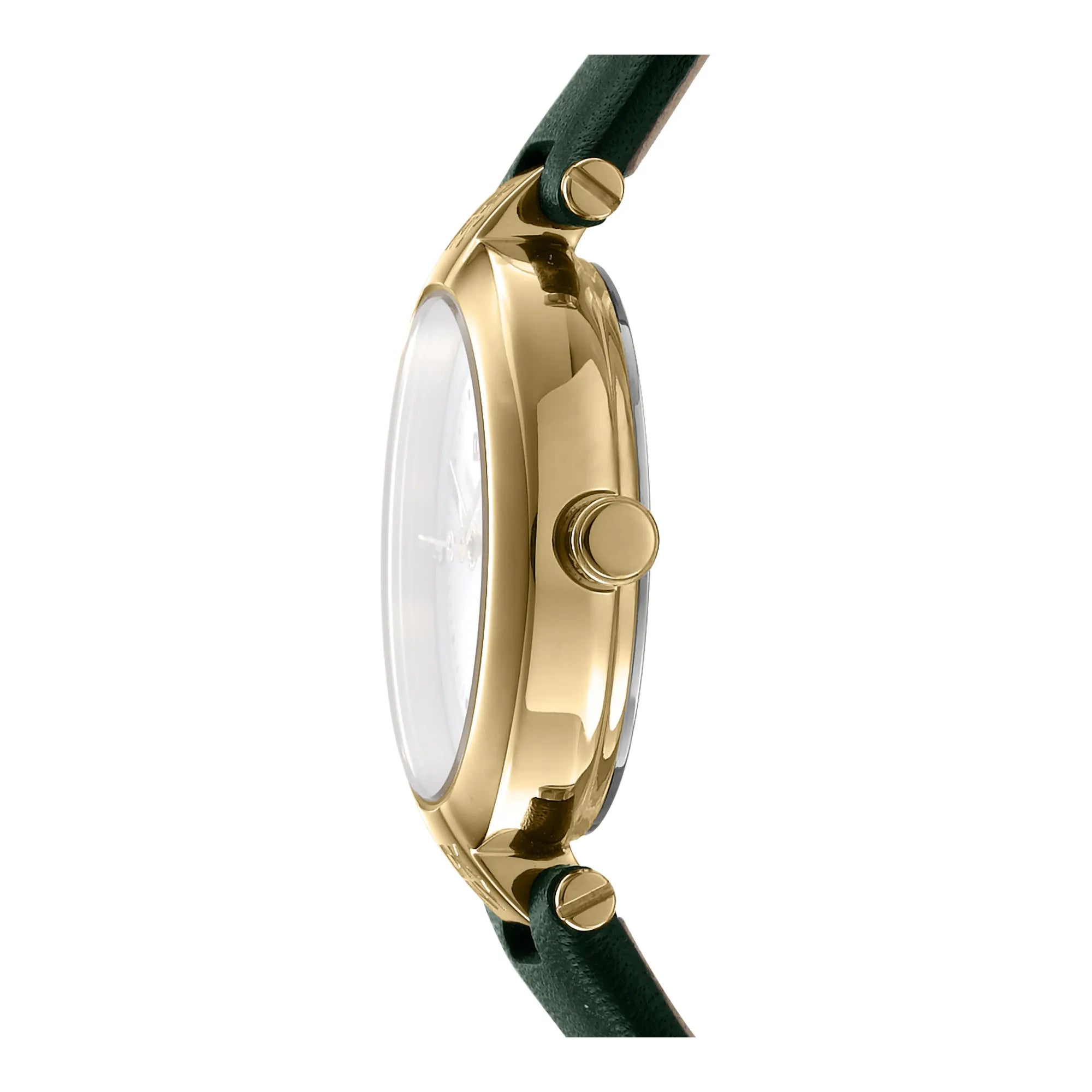 In het bruisende hart van New York City, waar mode en functionaliteit samenkomen, verschijnt een horloge dat de essentie van stedelijke elegantie belichaamt. Het DKNY Essential Mini horloge is een bewijs van verfijnd design, gemaakt voor de moderne vrouw die zowel stijl als inhoud waardeert. De ronde kast, gehuld in een luxueuze geelgouden tint, vangt het licht bij elke beweging en creëert een betoverende dans van reflecties. Met een bescheiden diameter van 28 mm is dit horloge de perfecte metgezel voor wie subtiliteit verkiest zonder in te leveren op verfijning. De zilvergrijze wijzerplaat, voorzien van drie wijzers, biedt een minimalistisch maar opvallend contrast met de levendige flesgroene leren band. Deze kleuraccent geeft een speelse twist, waardoor het een veelzijdige accessoire is voor elke outfit. De gesp sluiting zorgt voor een veilige pasvorm, terwijl het mineraalglas een helder zicht op de tijd biedt, beschermd tegen de uitdagingen van het dagelijks leven. Met een waterbestendigheid tot 50 meter is dit horloge net zo praktisch als stijlvol, klaar om je te vergezellen van kantoor tot een avondje uit. Aangedreven door een nauwkeurige kwartsbeweging is de DKNY Essential Mini niet zomaar een horloge, het is een statement van vooruitstrevend modebewustzijn en tijdloze elegantie.