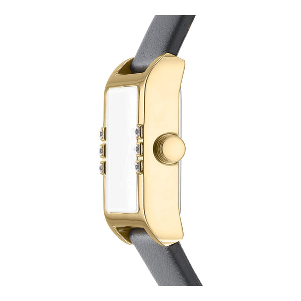 In the heart of urban elegance, where fashion meets function, emerges a timepiece that embodies the spirit of modern sophistication. The DKNY DK1L008 Westside Glitz is a testament to the art of watchmaking, crafted with precision and style for the contemporary woman. Its rectangular case, bathed in a luxurious yellow gold hue, captures the essence of timeless glamour, while the sleek 22mm diameter ensures a delicate yet striking presence on the wrist. The silver-grey dial, a canvas of understated elegance, is adorned with three hands that glide effortlessly, powered by a reliable quartz movement. This watch is not just an accessory, it's a statement of refined taste and urban chic. The mineral crystal offers a clear view of the dial, protected by a pull & push crown that adds a touch of practicality to its design. The mouse grey leather band, secured with a tang buckle, wraps comfortably around the wrist, offering a subtle contrast to the golden case. Water-resistant, this watch is ready to accompany you through the hustle and bustle of city life, without compromising on style. The DKNY Westside Glitz is more than a watch, it's a celebration of fashion-forward thinking, a piece that resonates with those who appreciate the finer things in life.