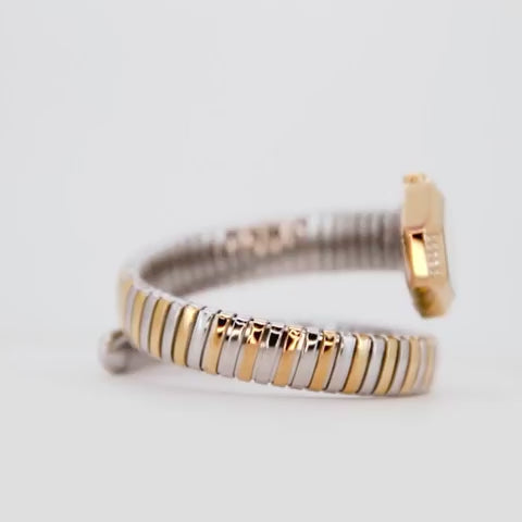 Crafted with a distinctive hexagonal stainless steel case, IP yellow gold plated for a luxurious finish, and adorned with 10 sparkling zircons, this watch is a true statement piece. The captivating silver grey dial is further enhanced by 4 dazzling zircons, catching the light with every movement. Its bi-color stainless steel band, featuring both silver grey and yellow gold IP plating, gracefully wraps around your wrist, embodying the iconic snake motif with sophisticated flair.