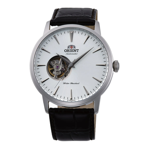 In the realm of timeless elegance, the ORIENT AG02 Open Heart watch stands as a testament to classic sophistication. Crafted with precision, this masterpiece from the ORIENT Classic family captures the essence of refined design. Its round, silver-grey case, with a diameter of 41mm, exudes a subtle yet commanding presence on the wrist. The light grey dial, adorned with a captivating open-heart feature, offers a glimpse into the intricate mechanical movement that powers this timepiece. With 22 jewels and a caliber of F6T22, it promises accuracy and reliability, boasting a daily precision of +25/-15. The transparent back reveals the artistry within, a true delight for watch enthusiasts. Encased in mineral crystal, the watch is water-resistant up to 50 meters, ensuring durability without compromising on style. The black leather band, secured with a tang buckle, complements the watch's classic aesthetic, making it a perfect companion for the modern gentleman. The pull & push crown adds a touch of practicality, while the automatic and hand-wound features offer versatility for any occasion. This ORIENT watch is not just a timekeeping device, it's a statement of elegance and tradition, a piece that transcends trends and stands the test of time.