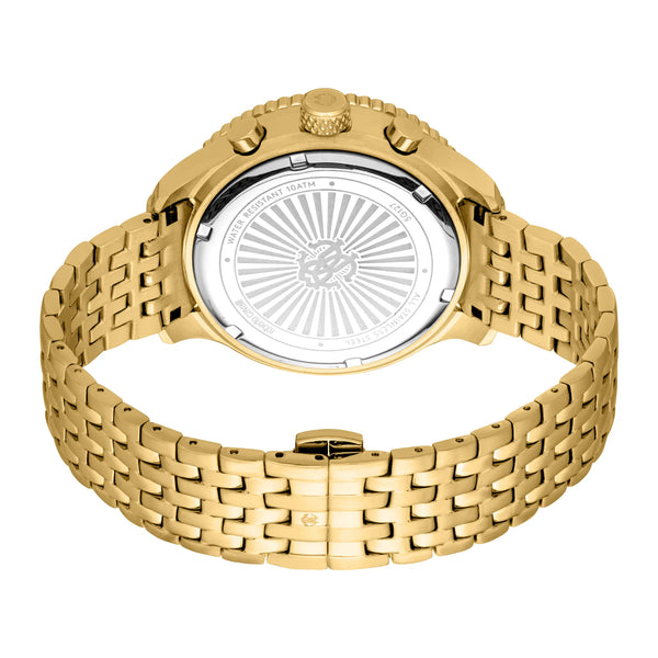 In the world of horology, where elegance meets precision, emerges a timepiece that embodies the essence of sophistication and style. Crafted in the heart of Swiss watchmaking, this Roberto Cavalli Gent watch is a testament to the brand's commitment to luxury and innovation. Its round case, bathed in the opulence of yellow gold, commands attention with a diameter of 44mm, making a bold statement on any wrist. The mineral crystal shields a striking black dial, where the art of timekeeping is elevated to a new level with a chronograph display and a date calendar, powered by the reliable JS25 quartz movement. The watch's refined design is further accentuated by a stainless steel band, also in yellow gold, which wraps around the wrist with a butterfly deployant clasp, ensuring both security and comfort. Water-resistant up to 100 meters, this timepiece is as versatile as it is stylish, ready to accompany you from the boardroom to the beach. The pull & push crown adds a touch of classic charm, while the 24-hour time feature caters to the modern man who values both form and function. This Roberto Cavalli watch is not just an accessory, it's a statement of fashion-forward thinking, a celebration of timeless elegance, and a reflection of the wearer's discerning taste.