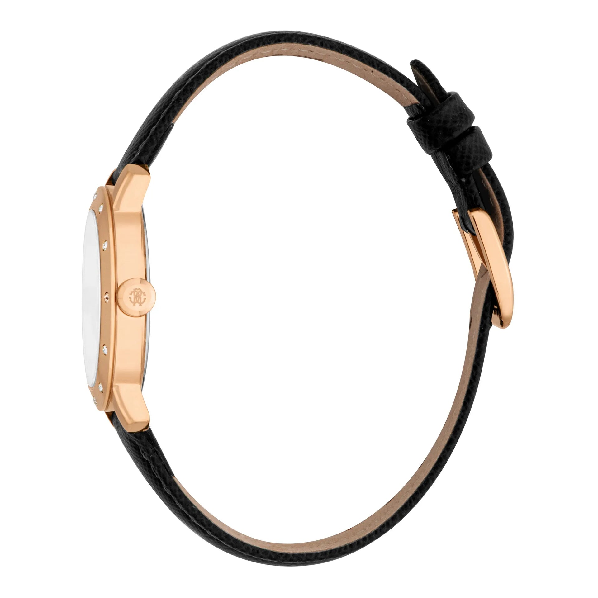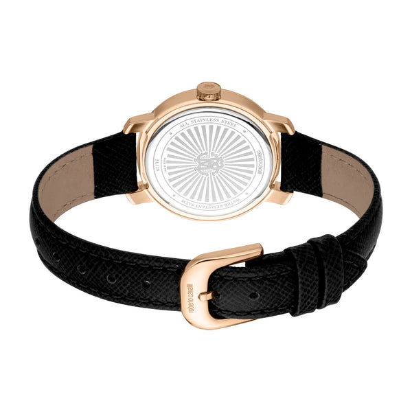 In the world of fashion, where elegance meets innovation, emerges a timepiece that captures the essence of sophistication and style. Crafted in the heart of Swiss watchmaking, this Roberto Cavalli Lady watch is a testament to refined design and exquisite craftsmanship. The round case, bathed in a luxurious rose gold hue, exudes a warm glow that complements the delicate wrist of the modern woman. With a case diameter of 30mm, it strikes the perfect balance between subtlety and presence, making it an ideal accessory for any occasion. The mineral crystal protects a silver-grey dial, where three hands dance gracefully, powered by the precision of a Quartz movement with a GL32 caliber. The pull & push crown adds a touch of practicality, ensuring ease of use. Encircling the wrist is a sleek black leather band, secured with a tang buckle, offering both comfort and style. With a water resistance of up to 50 meters, this watch is as versatile as it is beautiful, ready to accompany you from the boardroom to a night out. The Roberto Cavalli Lady watch is more than just a timepiece, it's a statement of fashion-forward thinking and timeless elegance, designed for the woman who knows her worth and isn't afraid to show it.