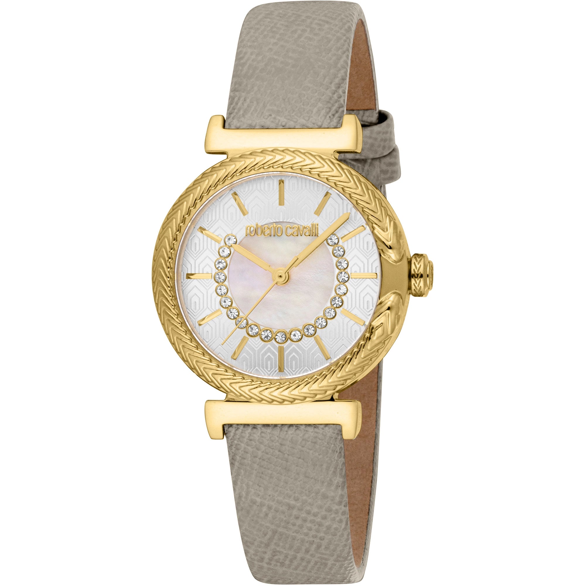 Beneath its beautiful exterior, this fashion watch is powered by a reliable CITIZEN GL34 quartz movement, offering precise 3-hand timekeeping. With a water resistance of 50mt, it is designed to withstand splashes and brief immersion, making it suitable for everyday wear. Each Roberto Cavalli Lady watch comes presented in an original Roberto Cavalli box, ensuring authenticity and making it an ideal gift or a treasured addition to your personal collection. Elevate your style with this iconic yellow gold and mother-of-pearl watch, available now at Watchello.