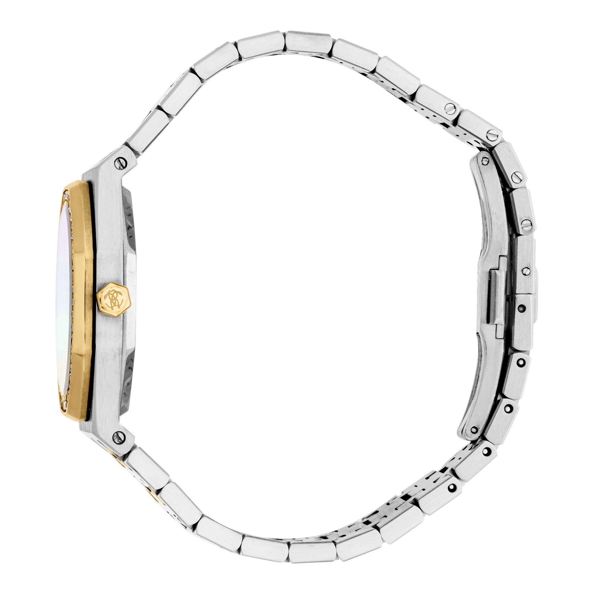 Omarm tijdloze aantrekkingskracht met dit voortreffelijke Roberto Cavalli-horloge, vervaardigd voor de moderne vrouw die haar eigen stijl bepaalt. Het betoverende tweekleurige ontwerp van roestvrij staal, fonkelend met schitterende zirkonen, omlijst een stralende parelmoeren wijzerplaat. Meer dan een uurwerk, is het een uiting van verfijnde elegantie, een weerspiegeling van je innerlijke glans. Laat het je pols sieren, een onweerstaanbaar accent voor elk moment, van zonovergoten brunches tot glamoureuze avondgelegenheden.